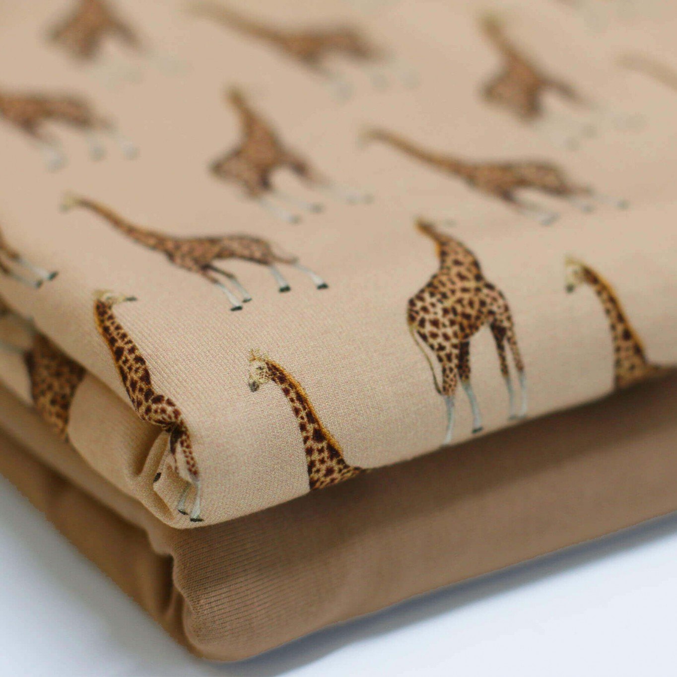 Deze prachtige French Terry stof met een digitale giraf print is gemaakt van 92% katoen 8% elastan en heeft een breedte van 150cm en een gewicht van 240 gr/m2